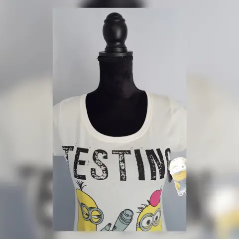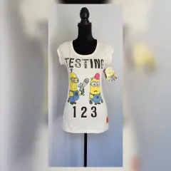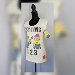Playera estilo T-Shirt en color PAJA, modelo "Minions" c/estampado delantero en tonos MULTICOLOR, cuello joya y manga corta. Talla G. Dimensiones cms: 35 hombro, 42 axila, 41 cintura, 48 zona baja, 64 largo, 8 largo manga. 100% algodón. P/lavado en casa.***POR LA COMPOSICIÓN DE LA PRENDA, ES STRETCH PERO NO COMO P/SUBIR A LA SIG TALLA***