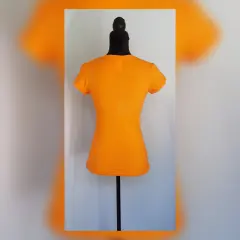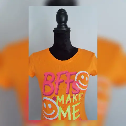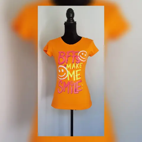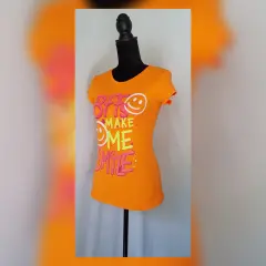 Playera estilo T-Shirt en color NARANJA TIGER, modelo "Smile" c/estampado delantero en tonos MULTICOLOR, cuello redondo y manga corta. Talla M. Dimensiones cms: 35 hombro, 41 axila, 37 cintura, 45 zona baja, 60 largo, 11 largo manga. 95% algodón, 5% elastano. P/lavado en casa.***POR LA COMPOSICIÓN DE LA PRENDA, ES STRETCH PERO NO COMO P/SUBIR A LA SIG TALLA***