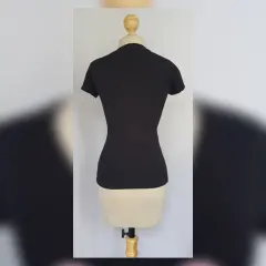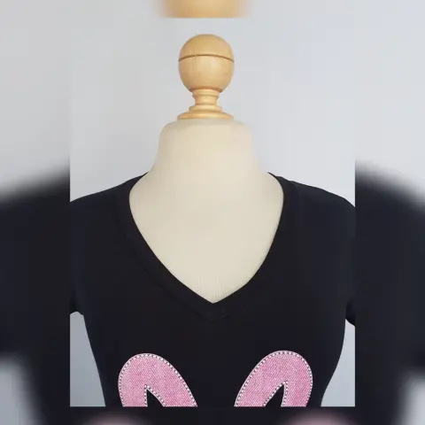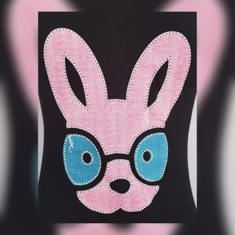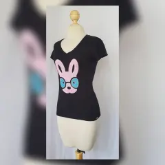 Playera estilo T-Shirt mod Conejín. Playera estilo T-Shirt en color NEGRO ÉBANO modelo "Conejín" con estampado delantero en tonos BLANCO, ROSA Y AZUL, cuello pico y manga corta. Por la composición de la tela es stretch. Talla G. Dimensiones cms: 41 hombro, 43 axila, 37 cintura, 45 zona baja, 59.5 largo, 9.5 largo manga. 95% algodón, 5% elastano. P/lavado en casa.***Esta marca maneja prendas de extraordinaria calidad, su algodón es orgánico y soporta ciclos de lavado en máquina sin problemas, no se deslavan los estampados y las telas salen casi sin arrugas.***