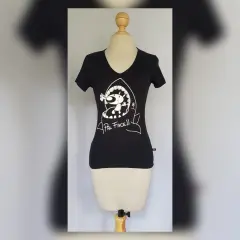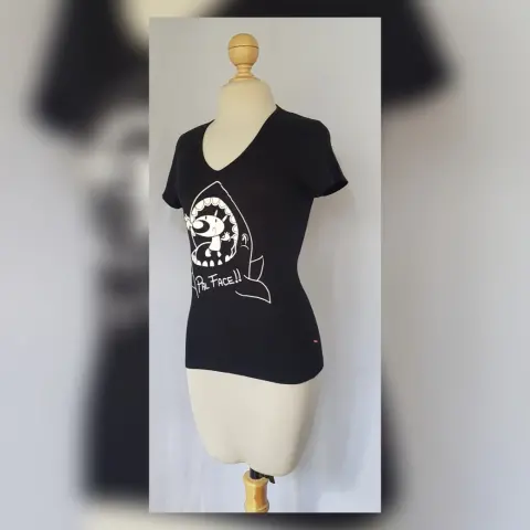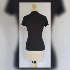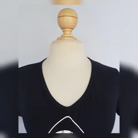 Playera estilo T-Shirt en color NEGRO ÉBANO modelo "Encintado" con estampado delantero en tono BLANCO ALABASTRO, cuello pico y manga corta. Por la composición de la tela es stretch. Talla G. Dimensiones cms: 36.5 hombro, 46.5 axila, 41 cintura, 47 zona baja, 59.5 largo, 14.5 largo manga. 95% algodón, 5% elastano. P/lavado en casa.***Esta marca maneja prendas de extraordinaria calidad, su algodón es orgánico y soporta ciclos de lavado en máquina sin problemas, no se deslavan los estampados y las telas salen casi sin arrugas.***