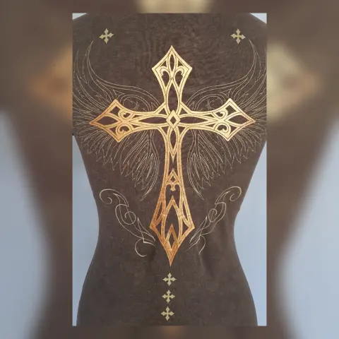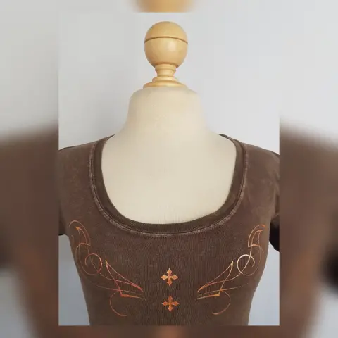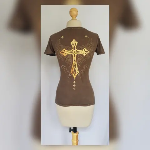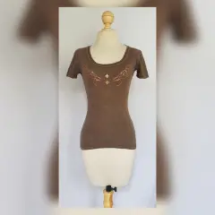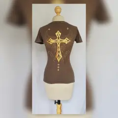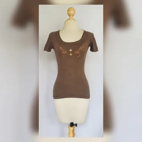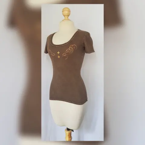 Playera estilo T-Shirt en color CAFÉ ALETILLA DEGRADADO modelo "Fly Cross" c/estampado delantero y trasero en tono COBRE, cuello joya y manga corta. Por la composición de la tela es stretch. Talla M. Dimensiones cms: 42 hombro, 45 axila, 39 cintura, 46 zona baja, 55 largo, 15 largo manga. 100% algodón. P/lavado en casa.***Esta marca maneja prendas de extraordinaria calidad, su algodón es orgánico y soporta ciclos de lavado en máquina sin problemas, no se deslavan los estampados y las telas salen casi sin arrugas.***EL EFECTO DEGRADADO DE LA PRENDA ES MUY BELLO***