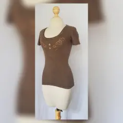 Playera estilo T-Shirt mod Fly Cross. Playera estilo T-Shirt en color CAFÉ ALETILLA DEGRADADO modelo "Fly Cross" c/estampado delantero y trasero en tono COBRE, cuello joya y manga corta. Por la composición de la tela es stretch. Talla M. Dimensiones cms: 42 hombro, 45 axila, 39 cintura, 46 zona baja, 55 largo, 15 largo manga. 100% algodón. P/lavado en casa.***Esta marca maneja prendas de extraordinaria calidad, su algodón es orgánico y soporta ciclos de lavado en máquina sin problemas, no se deslavan los estampados y las telas salen casi sin arrugas.***EL EFECTO DEGRADADO DE LA PRENDA ES MUY BELLO***