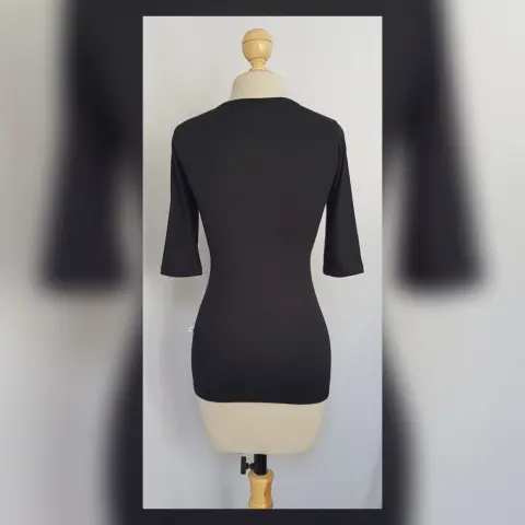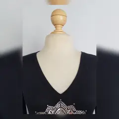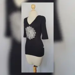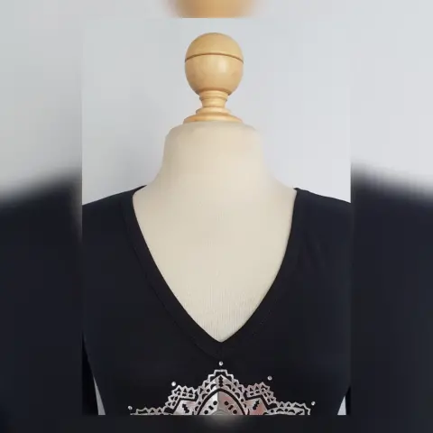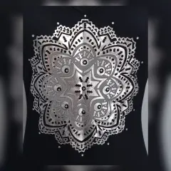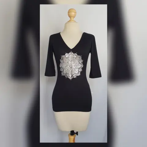 Playera estilo T-Shirt en color NEGRO ÉBANO modelo "MANDALA" c/estampado delantero en tono PLATEADO, cuello pico y manga 3/4 . Por la composición de la tela es stretch. Talla G. cms: 38 hombro, 48 axila, 40 cintura, 46 zona baja, 66 largo, 35 largo manga. 95% algodón, 5% elastano. P/lavado en casa.***Esta marca maneja prendas de extraordinaria calidad, su algodón es orgánico y soporta ciclos de lavado en máquina sin problemas, no se deslavan los estampados y las telas salen casi sin arrugas.***