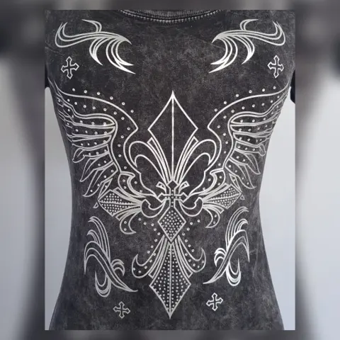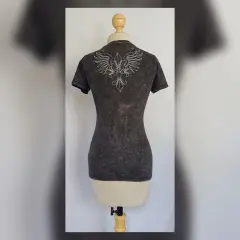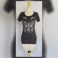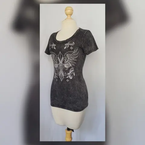Playera estilo T-Shirt mod Scroop Mineral. Playera estilo T-Shirt en color GRIS PIZARRA DEGRADADO modelo "Scoop Mineral" c/estampado delantero y trasero en tono PLATEADO y aplique bisutería translúcida, cuello redondo y manga corta. Por la composición de la tela es stretch. Talla M. Dimensiones cms: 38 hombro, 46 axila, 39 cintura, 46 zona baja, 62 largo, 17 largo manga. 100% algodón. P/lavado en casa.***Esta marca maneja prendas de extraordinaria calidad, su algodón es orgánico y soporta ciclos de lavado en máquina sin problemas, no se deslavan los estampados y las telas salen casi sin arrugas.***EL EFECTO DEGRADADO DE LA PRENDA ES MUY BELLO***