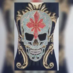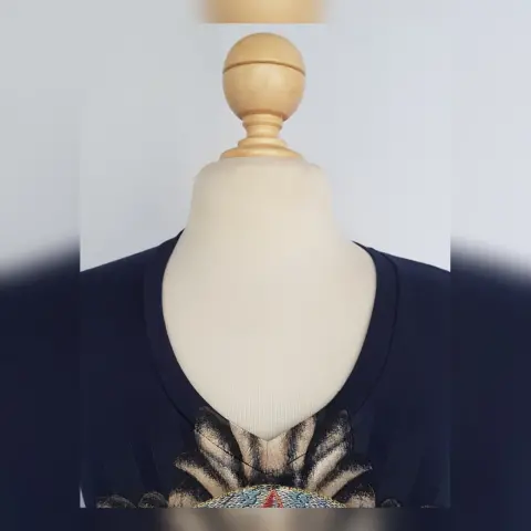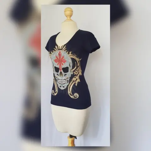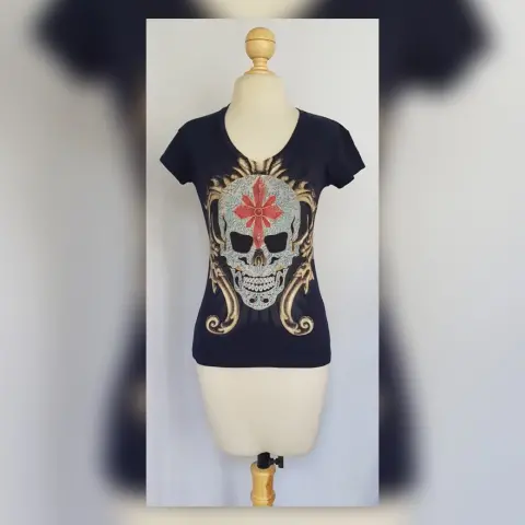 Playera estilo T-Shirt en color AZUL MARINO modelo "Stich Sku" con estampado delantero en tonos ORO, PAJA, BLANCO, ROJO, NEGRO Y AZUL, cuello pico y manga corta. Por la composición de la tela es stretch. Talla G. Dimensiones cms: 40.5 hombro, 45 axila, 38 cintura, 46 zona baja, 59.5 largo, 9.5 largo manga. 95% algodón, 5% elastano. P/lavado en casa.***Esta marca maneja prendas de extraordinaria calidad, su algodón es orgánico y soporta ciclos de lavado en máquina sin problemas, no se deslavan los estampados y las telas salen casi sin arrugas.***