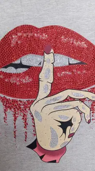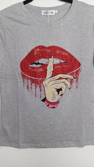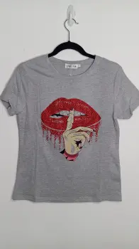 Playera de manga corta, color gris. Estampado de labios con brillos. Nueva con etiqueta, marca Yao Star, talla S/M, medidas aprox 39cm de hombros, 46cm de axila a axila, 58cm de largo. Precio $200