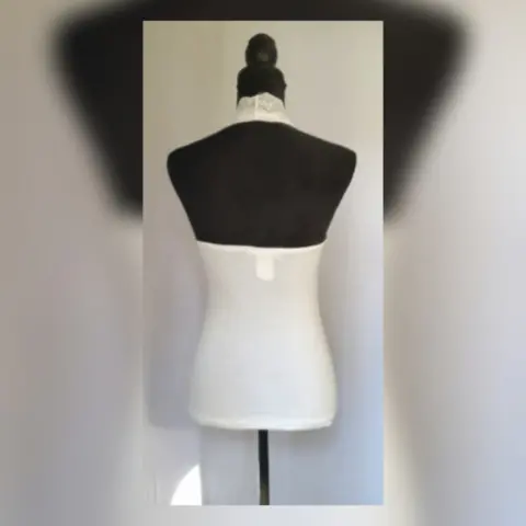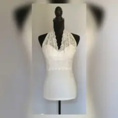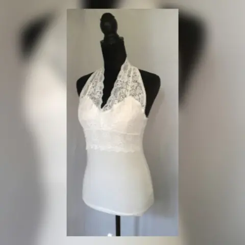 Tank top color BLANCO POLAR c/ribete de encaje zona busto, corte tipo halter y copas preformadas p/mejor ajuste. Talla G. Dimensiones cms: 42 axila, 38 cintura, 45 zona baja, 61 largo. 95% algodón, 5% elastano. P/lavado en casa.*POR LA COMPOSICIÓN DE LA PRENDA ES STRETCH PERO NO COMO P/SUBIR A LA SIG TALLA*