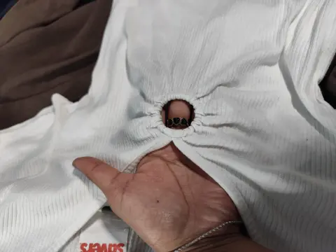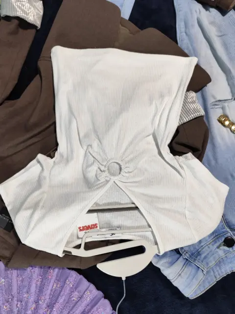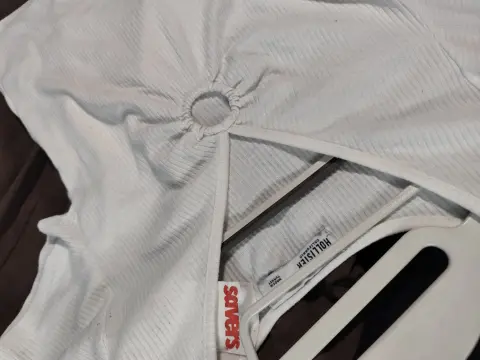 Playera corta blanca (Top), escote en V, con un círculo (es un aro). Tela rib, stretch, amolda al cuerpo. Un básico. 👌😊 Talla Ch, posible M.