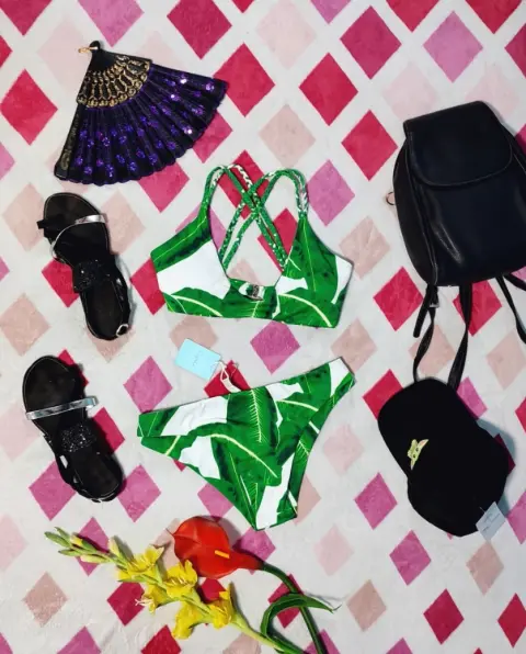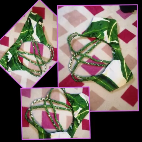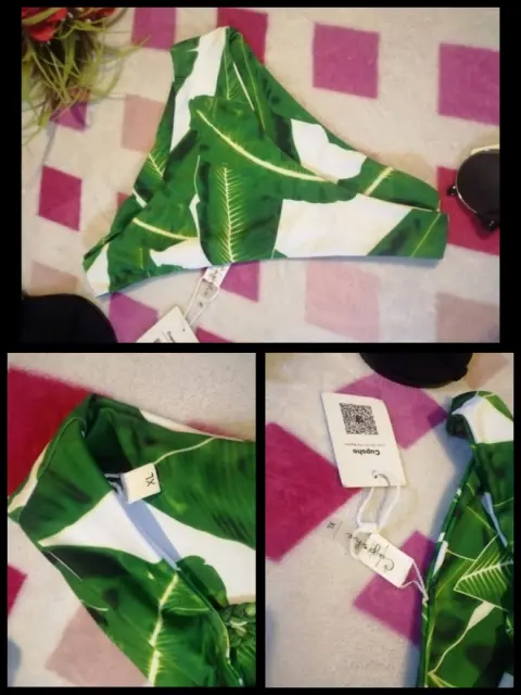 •Te interesa? Escucho ofertas•Deseas varias prendas? armo tu paquete✨ Traje de baño 2pzas.Blanco con print de hojas verdes.Top con tirantes trenzados,cruzados en la espalda;broche en la parte trasera;copas preformadas(NO se quitan). Braguita tiro medio. La etiqueta dice XL, queda a una talla 11,13 (posible 9) de pantalón. Top Unitalla. Dudas? Te paso medidas