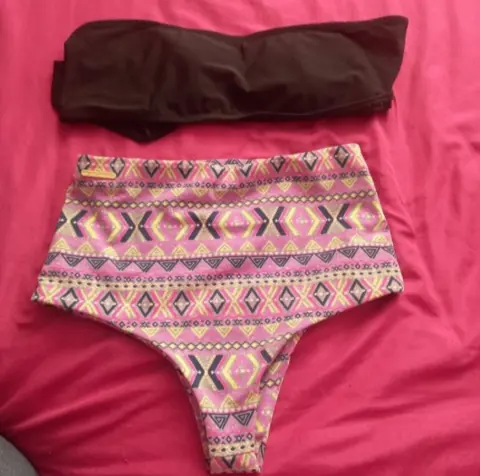 Traje de baño de 2 piezas la parte del busto es para amarrarse como se muestra en las fotos tiene sus esponjas es talla unitalla no se recomienda para busto grande, el calzon es de tela gruesa no esta roto se encuentra en buenas condiciones con diseño colorido es calzon llega hasta la cintura en la etiqueta menciona chica- mediana.