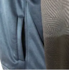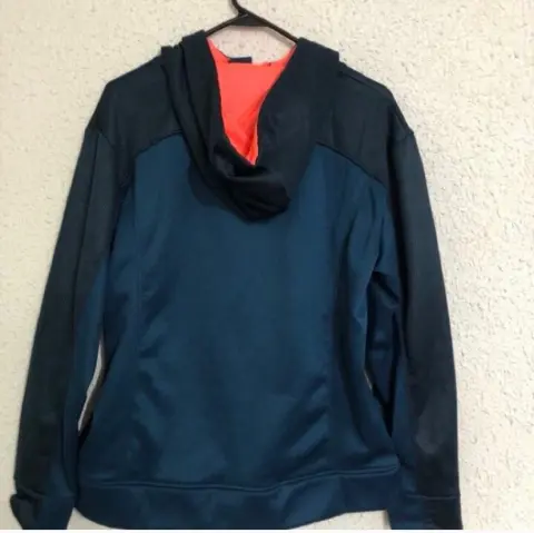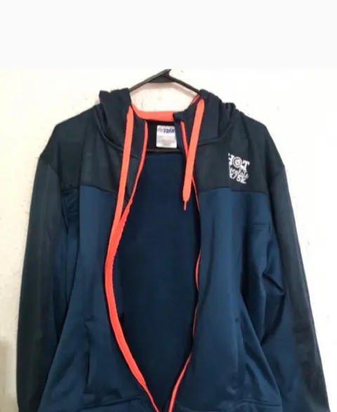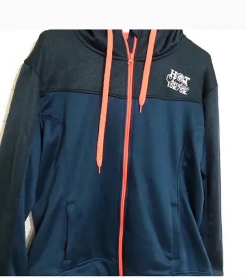 BONITA CHAMARRA DEPORTIVA MARCA HOT CHOCOLATE COLOR AZUL ACERO CON INTERIOR NARANJA GORRO Y BOLSAS LATERALES TALLA EN ETIQUETA G