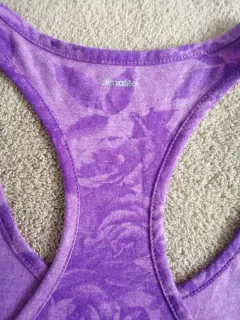 Playera deportiva floreada, tono morado y lila, T-M, axila 46 cms., largo 70 cms. ( tomando en cuenta los tirantes) aberturas laterales.