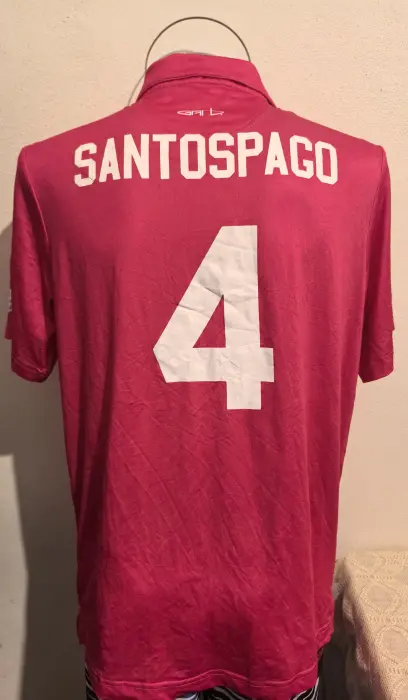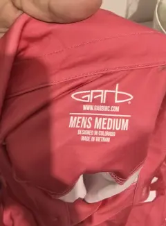 Playera deportiva tipo polo, marca GARB, talla mediana. Color es rosa con blanco. Tela cómoda y fresca. 92% poliester y 8% spandex.