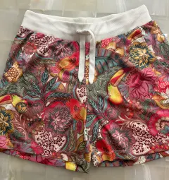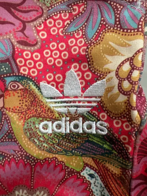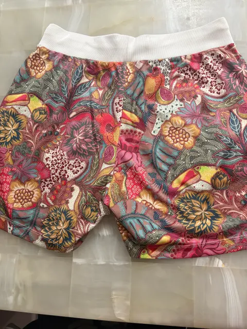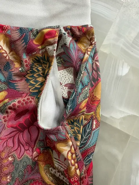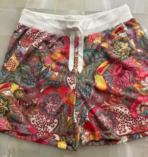 Short deportivo. Short deportivo Adidas de diseño totalmente estampado. Su print tropical combina flores, follaje y aves en tonos vivos como rosa, amarillo, azul y naranja, La pretina ancha de resorte en color blanco con ajuste de cordón, con bolsas ambos lados