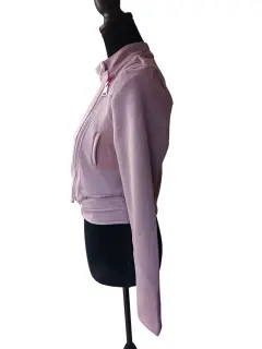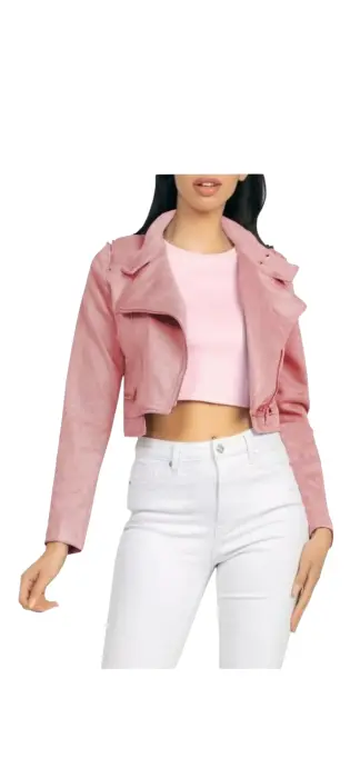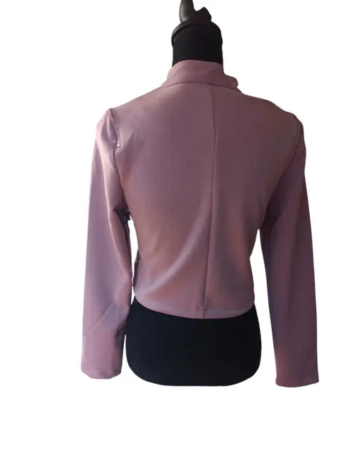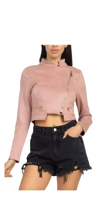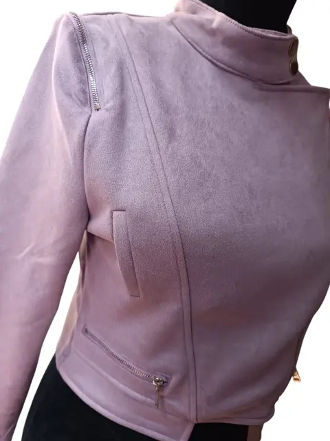 BLAZER CORTO DE GAMUZA.COLOR LILA,MARCA STORY ON, MIDE DE HOMBRO A HOMBRO 38 CM, DE AXILA A AXILA 45 CM, DE LARGO 43 CM