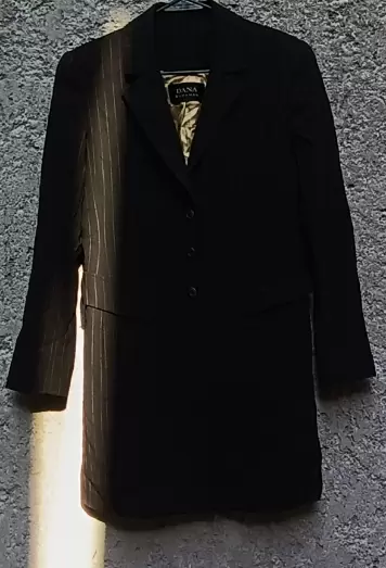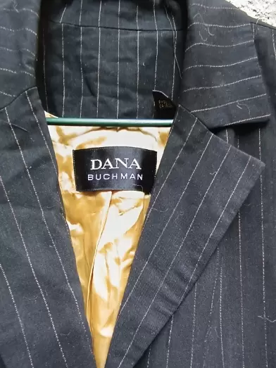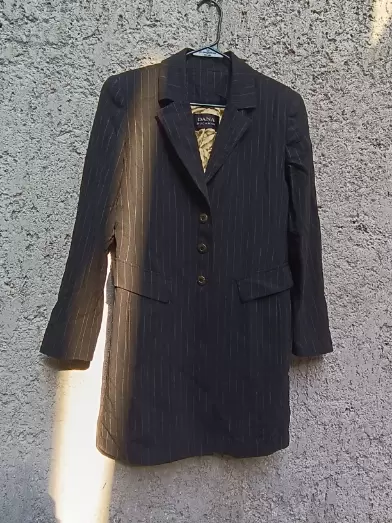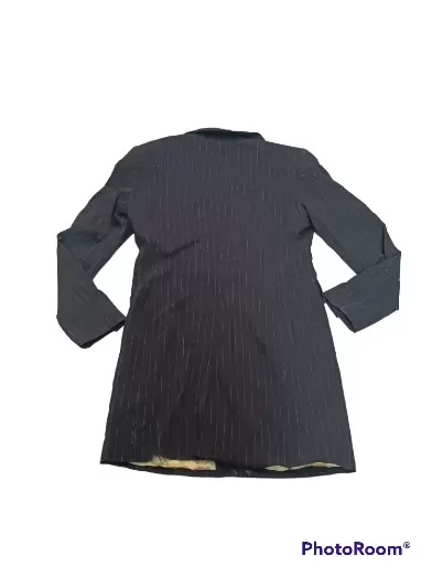 BLAZER NEGRO LARGO, CON FRANJAS DORADAS,DE USO, SIN DETALLES,MARCA DANA BUCHMAN,TALLA 4, 98 % LANA, 2 % OTRAS,MIDE DE HOMBRO A HOMBRO 43 CM, DE AXILA A AXILA 55 CM, DE LARGO 87 CM,LOS BOLSILLOS NO SON FUNCIONALES