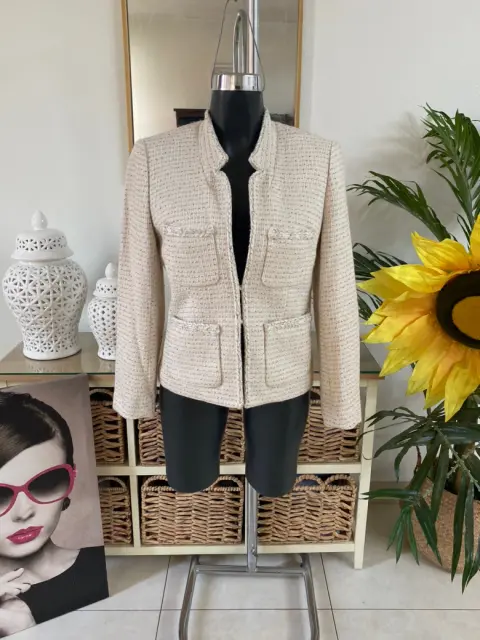 Intacto & como nuevo✨🫶🏻. Blazer elegante tweed tipo Channel. Bolsas funcionales. Blanco con hilo dorado, plateado. ★·.·´𝑴𝒆𝒅𝒊𝒅𝒂𝒔`·.·★Hombro a hombro 37 cmAxila a axila 45 cmCintura 43 cmLargo 60 cm🧵42% poliéster, 33% acrílico, 20% lana, 4% otras fibras🪡