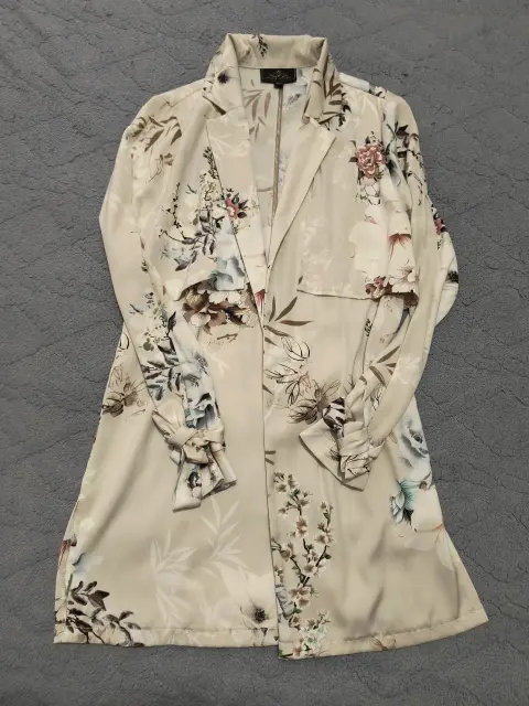 Saco tipo gabardina. Hermoso y fresco saco tipo gabardina talla CH color beige con flores , abertura en los lados y cintas en los puños