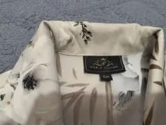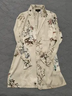 Saco tipo gabardina floreado. Hermoso y fresco saco tipo gabardina talla CH color beige con flores , abertura en los lados y cintas en los puños