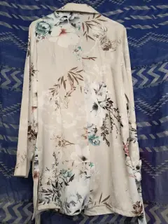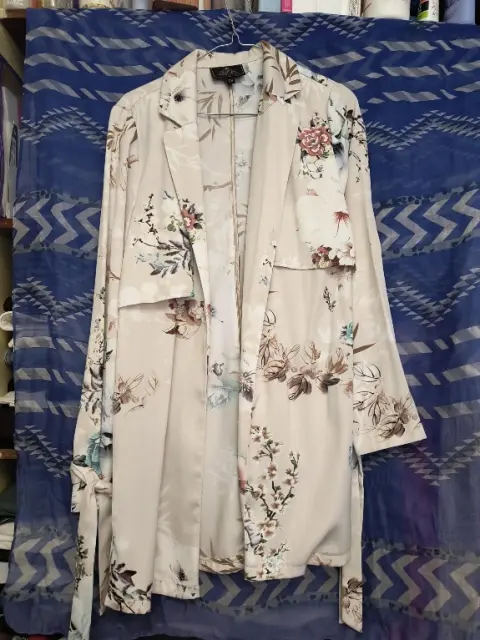 Hermoso y fresco saco tipo gabardina talla CH color beige con flores , abertura en los lados y cintas en los puños