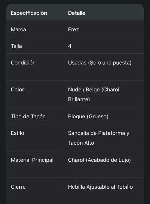 • Marca: Erez• Talla: 4• Condición: Usadas una sola vez (como nuevas). Se encuentran en condiciones impecables, sin signos visibles de desgaste.✨ Características Destacadas• Color Sofisticado: Tonalidad nude/beige brillante (efecto charol), un color versátil que alarga visualmente la pierna y combina con absolutamente todo, desde jeans hasta vestidos de fiesta.• Diseño de Plataforma: La plataforma delantera no solo añade altura, sino que también reduce la inclinación percibida del tacón, proporcionando una pisada más cómoda y estable para que puedas bailar toda la noche.• Tacón Bloque (Grueso): El tacón ancho y robusto ofrece una máxima estabilidad y soporte, contrastando con la ligereza del diseño. Es la opción ideal para quienes desean altura sin sacrificar la comodidad.• Material: Acabado de charol que les da un look lujoso, elegante y fácil de limpiar.• Detalles: Cierre de hebilla ajustable en el tobillo para un ajuste perfecto y seguro.