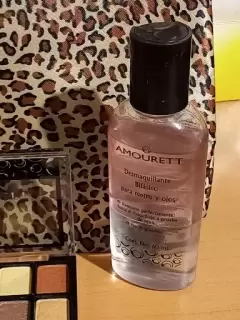 Kit que contiene una cosmetiquera animal print, desmaquillante, tratamiento para pestañas, una tableta de sombras, polvo compacto, delineador líquido en tono cafe y labial