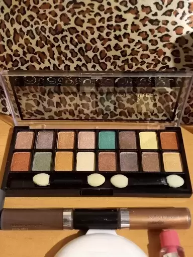 Kit de maquillaje con su cosmetiquera. Kit que contiene una cosmetiquera animal print, desmaquillante, tratamiento para pestañas, una tableta de sombras, polvo compacto, delineador líquido en tono cafe y labial