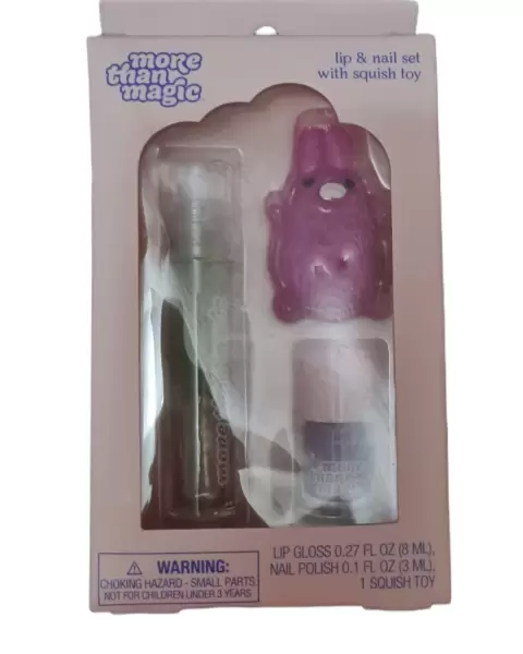 SET DE 3 PIEZAS MARCA MORE THAN MAGIC,INCLUYE 1 GLOSS SIN COLOR DE 8 ML,1 BARNIZ DE POLISH DE 3 ML COLOR MORADO Y 1 SQUISHY FIGURA CONEJA,INCLUYEN 2 SET