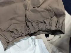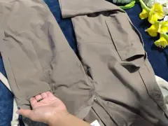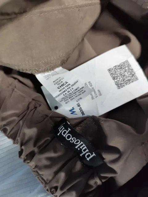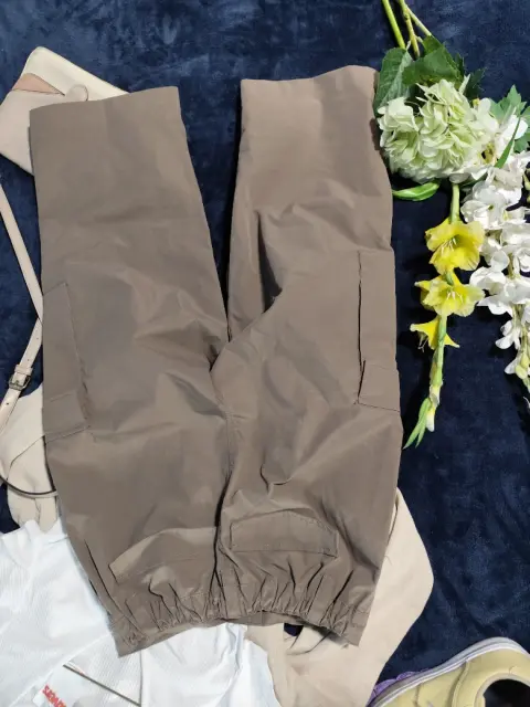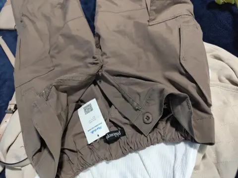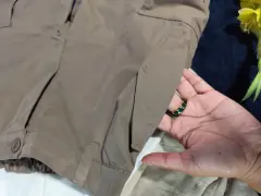 Bermuda cargo. Bermuda café cargo. Tela rígida (lona), semibrillante. Tiro alto, resorte en la cintura para ajustar. 4 bolsillos, 2 laterales, 2 cargo. Talla Ch.