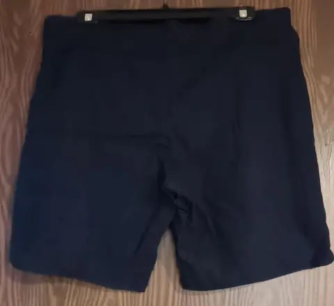 Short de tela azul marino. Short de tela. Color azul marino. Con bolsas laterales y abertura de 5 CM en el área de la pierna. Marca: Mario Serrani Italy. Talla: Grande. Hecho en: China. Fabricado en: 63% rayón, 21% nylon, 13% poliéster y Elastano 3%.Medidas: cintura: 44 CM. Largo: 49 CM.