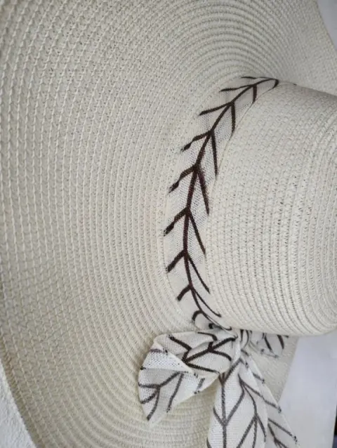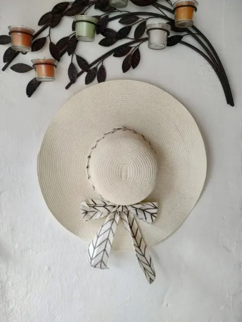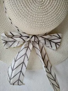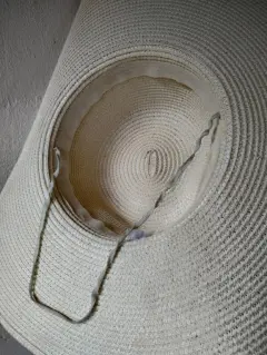 Sombrero color beigeCon un lindo liston en tonos cafésIdeal para cubrir del sol de una manera eleganteSin detallesUsado una vezMide 46 cm de diámetro20 cm de diámetro en dónde va la cabeza