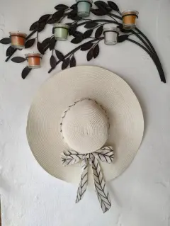Sombrero para sol y playa grande. Sombrero color beigeCon un lindo liston en tonos cafésIdeal para cubrir del sol de una manera eleganteSin detallesUsado una vezMide 46 cm de diámetro20 cm de diámetro en dónde va la cabeza