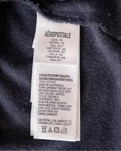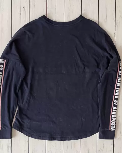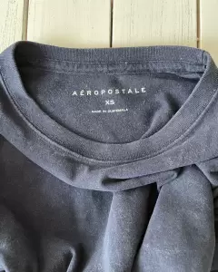Sudadera ligera azul marino AÉROPOSTALE. Sudadera azul marino cuello redondo.Talla: XS pero viene muy amplia Trae estampadas las mangas con el diseño que se ve en las fotos.Medidas: hasta 63 cm de axila y 62 cm de largo
