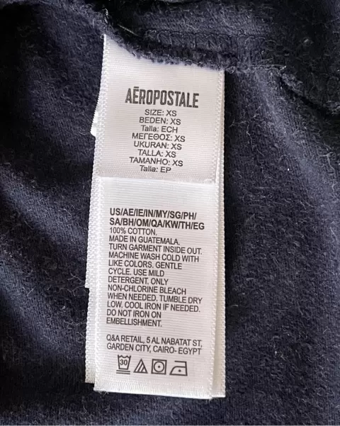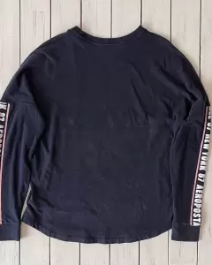 Sudadera azul marino cuello redondo.Talla: XS pero viene muy amplia Trae estampadas las mangas con el diseño que se ve en las fotos.Medidas: hasta 63 cm de axila y 62 cm de largo