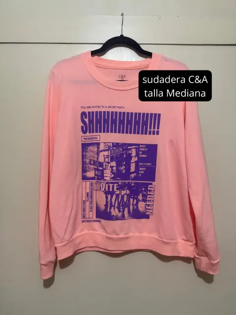 Sudadera talla Mediana C&A. Toda la ropa vendida se manda lavadita, lista para que la puedas usar. También te puedo hacer paquetes de más prendas para que aproveches el envío. Cualquier duda que tengas no dudes en escribirme. Las medidas son tomadas de la parte del pecho de axila a axila y de lo largo que queda el sweater Tiene muy poco uso