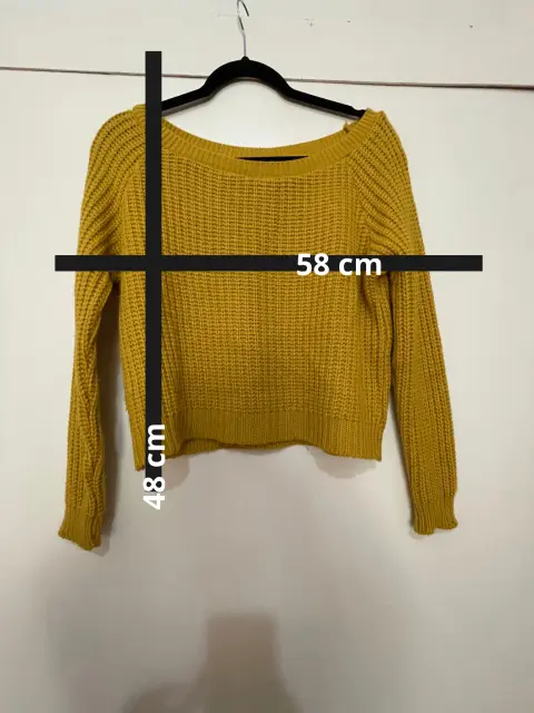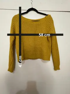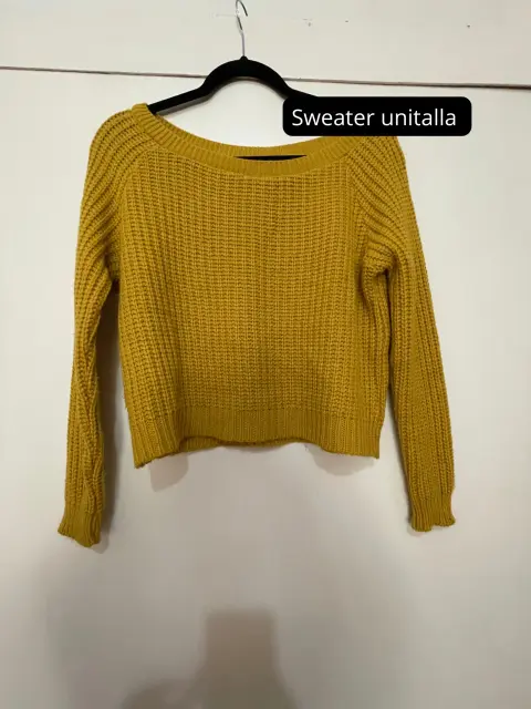 Sweater color mostaza Unitall. Toda la ropa vendida se manda lavadita, lista para que la puedas usar. También te puedo hacer paquetes de más prendas para que aproveches el envío. Puedes también ofertar a partir de dos prendas Las medidas son tomadas de la parte del pecho de axila a axila y del largo que queda (es escotado del hombro) Desconozco la talla y la marca ya que el quite la etiqueta