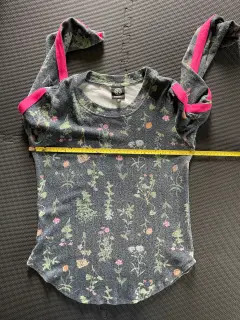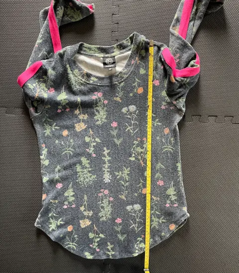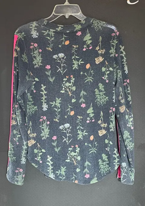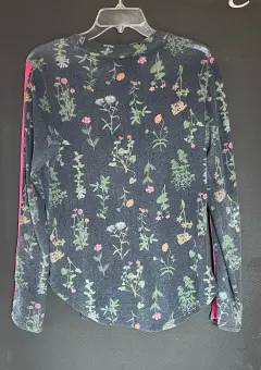 Bobeau suéter ligero o blusa azul marino con estampado floreado. Manga larga y cuello redondo. Con línea decorativa rosa en mangas y terminado en curva. Talla: SColor: azul marino/multicolorMaterial: 74% rayon, 21% poliéster y 4% spandexCuidado: lavar a mano Medidas: ancho de sisa a sisa: 47 cm, y largo desde hombro hasta abajo: 64 cm