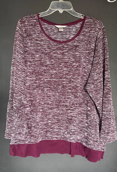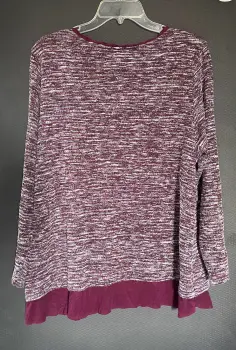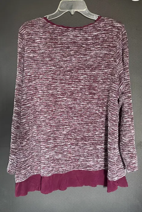 Cj Banks suéter ligero jaspeado en color vino. Con cuello redondo y terminados vino. Ideal para look semi formal en días frescos.Talla: 1XColor: vino/blancoMaterial: 74% poliéster, 24% rayón y 2% spandex.Cuidado: lavar en máquina Medidas: ancho de sisa a sisa: 61 cm, largo desde hombro hasta abajo: 66 cm