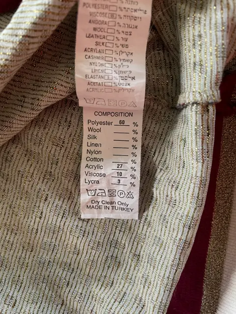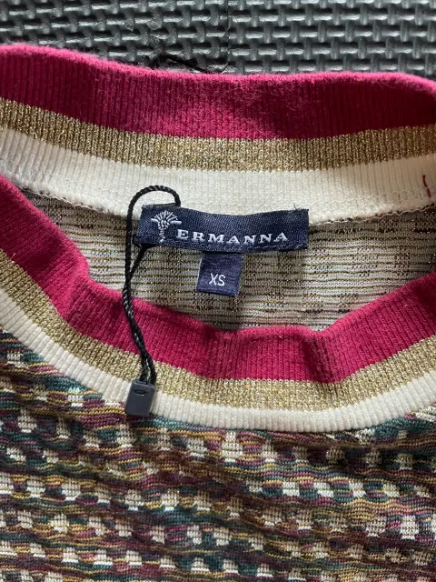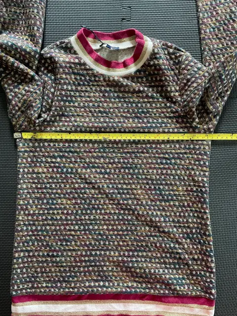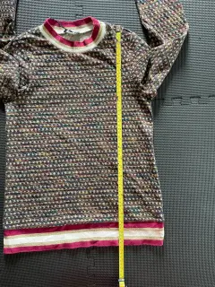 Ermanna suéter multicolor 👩. Ermanna suéter multicolor con patrón en verde, rojo y café con manchas en beige y destellos metálicos. Cuello redondo y manga larga. Bordes rosa y beige en puños y cuello. Ideal para todo tipo de reunión.Talla: XSColor: multicolor Material: 60% poliéster, 27% acrilico, 10% viscosa y 3% lycra.Cuidado: lavar en secoMedidas: ancho de sisa a sisa: 42 cm, largo desde hombro hasta abajo: 59,5 cm