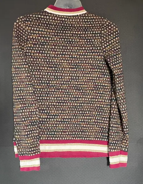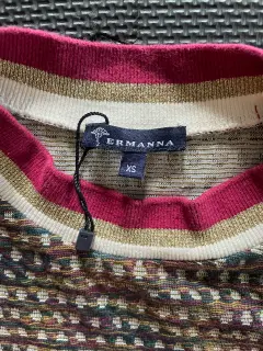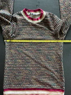 Ermanna suéter multicolor con patrón en verde, rojo y café con manchas en beige y destellos metálicos. Cuello redondo y manga larga. Bordes rosa y beige en puños y cuello. Ideal para todo tipo de reunión.Talla: XSColor: multicolor Material: 60% poliéster, 27% acrilico, 10% viscosa y 3% lycra.Cuidado: lavar en secoMedidas: ancho de sisa a sisa: 42 cm, largo desde hombro hasta abajo: 59,5 cm