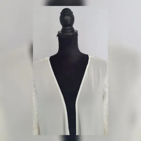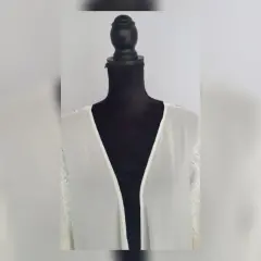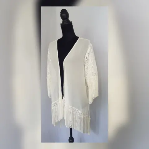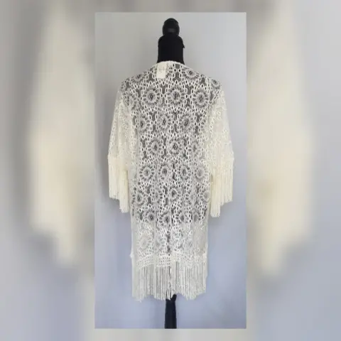 Kimono c/Aplique Encaje MARFIL. Kimono color MARFIL c/aplique de encaje zonas espalda y mangas, detalle de flecos en mangas y zona baja, sin sistema de cierre y cuello pico. Talla G. Dimensiones cms: 43 hombro, 54 axila, 96 zona baja, 71.5 largo, 29.5 largo manga. 100% poliéster. Para lavado en casa.
