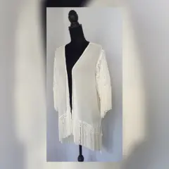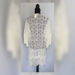 Kimono color MARFIL c/aplique de encaje zonas espalda y mangas, detalle de flecos en mangas y zona baja, sin sistema de cierre y cuello pico. Talla G. Dimensiones cms: 43 hombro, 54 axila, 96 zona baja, 71.5 largo, 29.5 largo manga. 100% poliéster. Para lavado en casa.