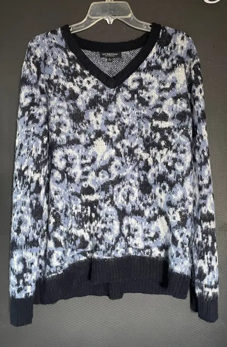 Liverpool suéter de invierno👩. Liverpool suéter de invierno afelpado en negro, azul marino, azul claro y blanco. Cuello en V con terminado en cuello, puños y final en azul marino. Ideal para días fríos.Talla: LColor: negro/azules/blancoCuidado: lavar en máquina Medidas: ancho de sisa a sisa: 59 cm, largo desde hombro hasta abajo: 65,5 cm