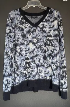 Liverpool suéter de invierno afelpado en negro, azul marino, azul claro y blanco. Cuello en V con terminado en cuello, puños y final en azul marino. Ideal para días fríos.Talla: LColor: negro/azules/blancoCuidado: lavar en máquina Medidas: ancho de sisa a sisa: 59 cm, largo desde hombro hasta abajo: 65,5 cm