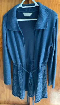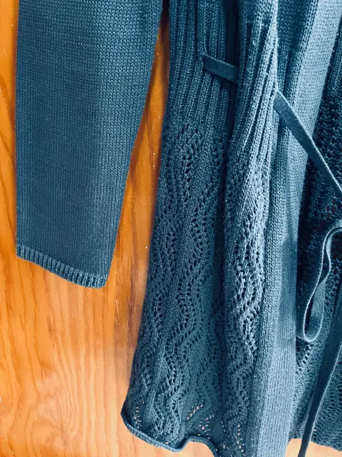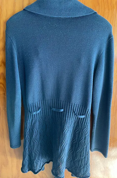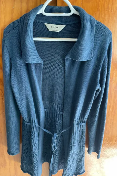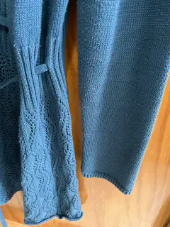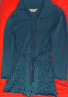 Lindo suéter largo abierto, sin botones. Tiene un listón del mismo material para amarrarse. Parte inferior calada. Color azul plúmbago. Es unitalla. Usado algunas veces, pero está en muy buen estado. Ancho de hombros 42 cms, ancho de axila 44 cms, largo 78 cms.