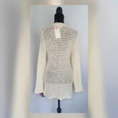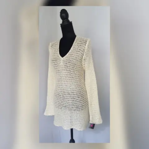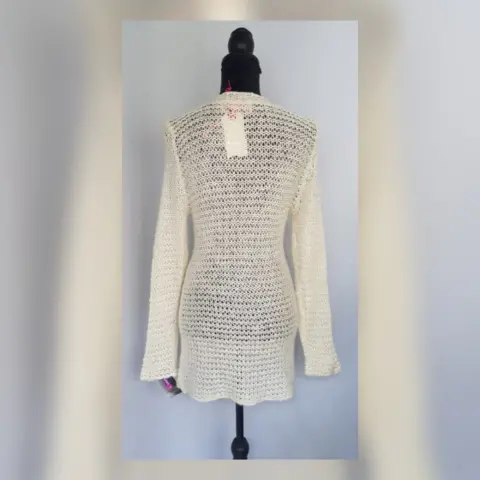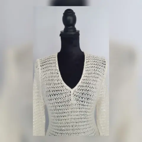 Suéter largo estilo blusón en tejido de punto c/estructura color MARFIL c/aplique lentejuela cosida tono PLATA, cuello V y manga larga. Talla G. Dimensiones cms: 40 hombro, 46 axila, 40 cintura, 54 zona baja, 74 largo, 66 largo manga. 61% acrílico, 39% poliéster. Para lavado en casa.***EL TONO EXACTO ESTÁ EN LA FOTO NÚM 5******EL DESTELLO QUE GENERA LA LENTEJUELA EN LA PRENDA ES MUY BELLO Y NO LO CAPTA LA FOTOGRAFÍA***