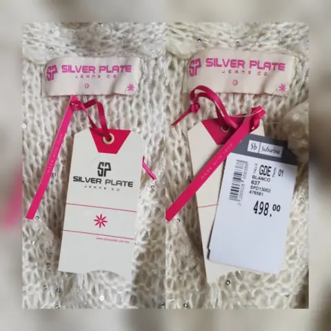 Suéter - Blusón Aplique Lentejuela. Suéter largo estilo blusón en tejido de punto c/estructura color MARFIL c/aplique lentejuela cosida tono PLATA, cuello V y manga larga. Talla G. Dimensiones cms: 40 hombro, 46 axila, 40 cintura, 54 zona baja, 74 largo, 66 largo manga. 61% acrílico, 39% poliéster. Para lavado en casa.***EL TONO EXACTO ESTÁ EN LA FOTO NÚM 5******EL DESTELLO QUE GENERA LA LENTEJUELA EN LA PRENDA ES MUY BELLO Y NO LO CAPTA LA FOTOGRAFÍA***