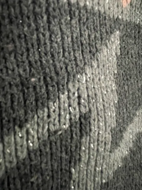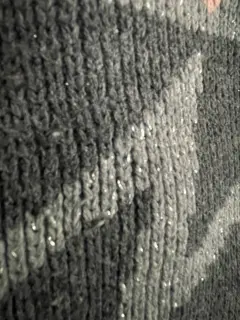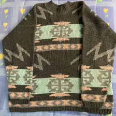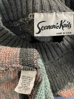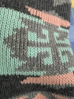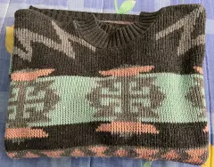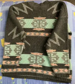 Suéter cerrado, fondo gris oscuro con motivos tipo oriental en rosa claro, verde agua y gris claro con brillos plateados. Talla grande. Ancho de axilas 53 cms, largo 61 cms. Usado algunas veces, pero en excelente estado.