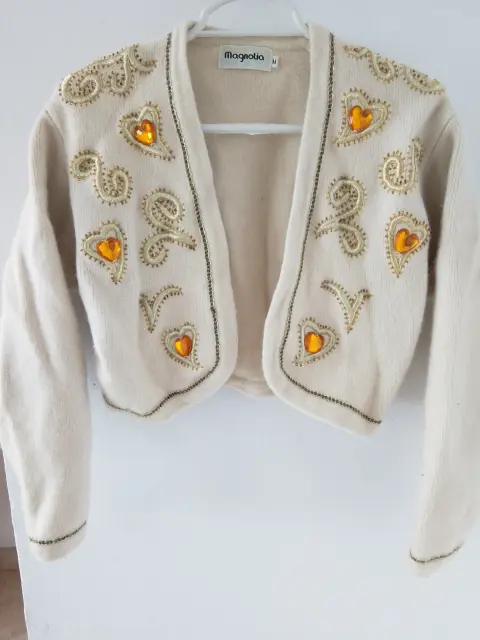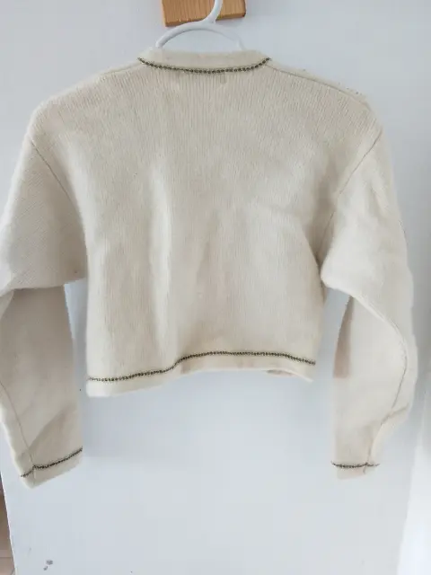 Suéter corto beige. Tiene toques como piedra naranjas Sin botones De lana Manga 46.5+ puño 2.5=49 Hombro a hombro 42 Largo parte frente 38,parte atrás 39
