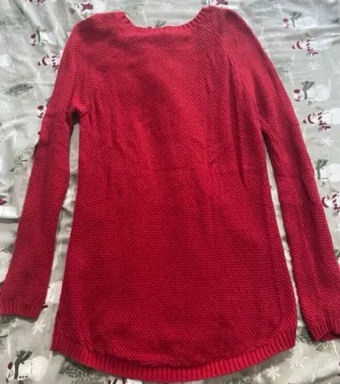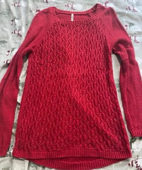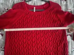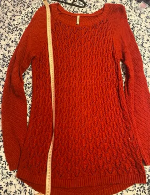 Súper bonito suéter de punto! Largo. Talla S, pero le queda a una M también. Es muy bonito el punto es más amplio en la parte de adelante y en el resto del suéter más pequeño